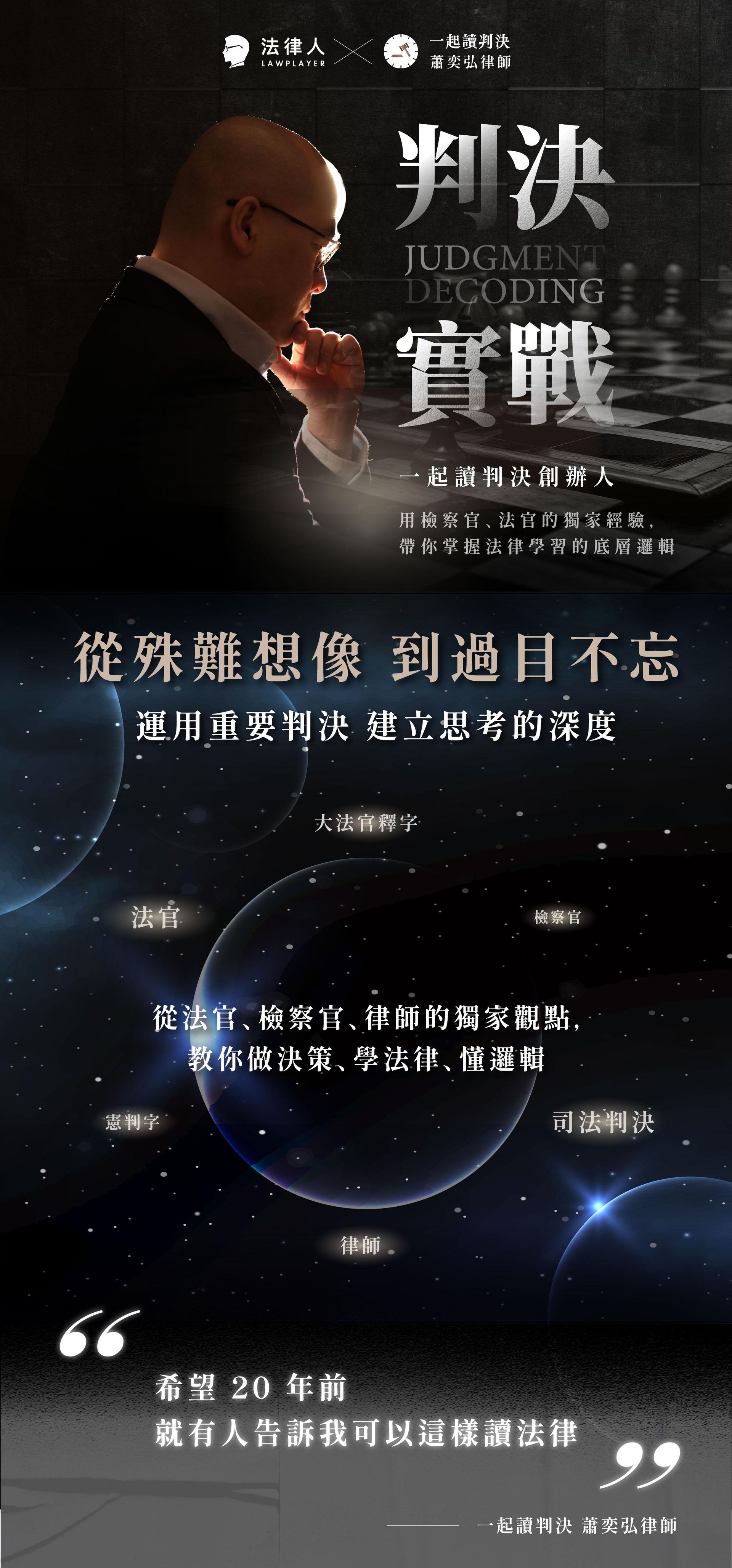 「判決實戰」由一起讀判決創辦人蕭奕弘律師,結合法官、檢察官、律師三種身份,帶你打開學習、理解和記憶法律的廣度與深度。用憲法法庭、大法官釋字、重要判決,貫串法律學習的核心,讓法律,一看就懂、一讀就會,一想就會寫 。
