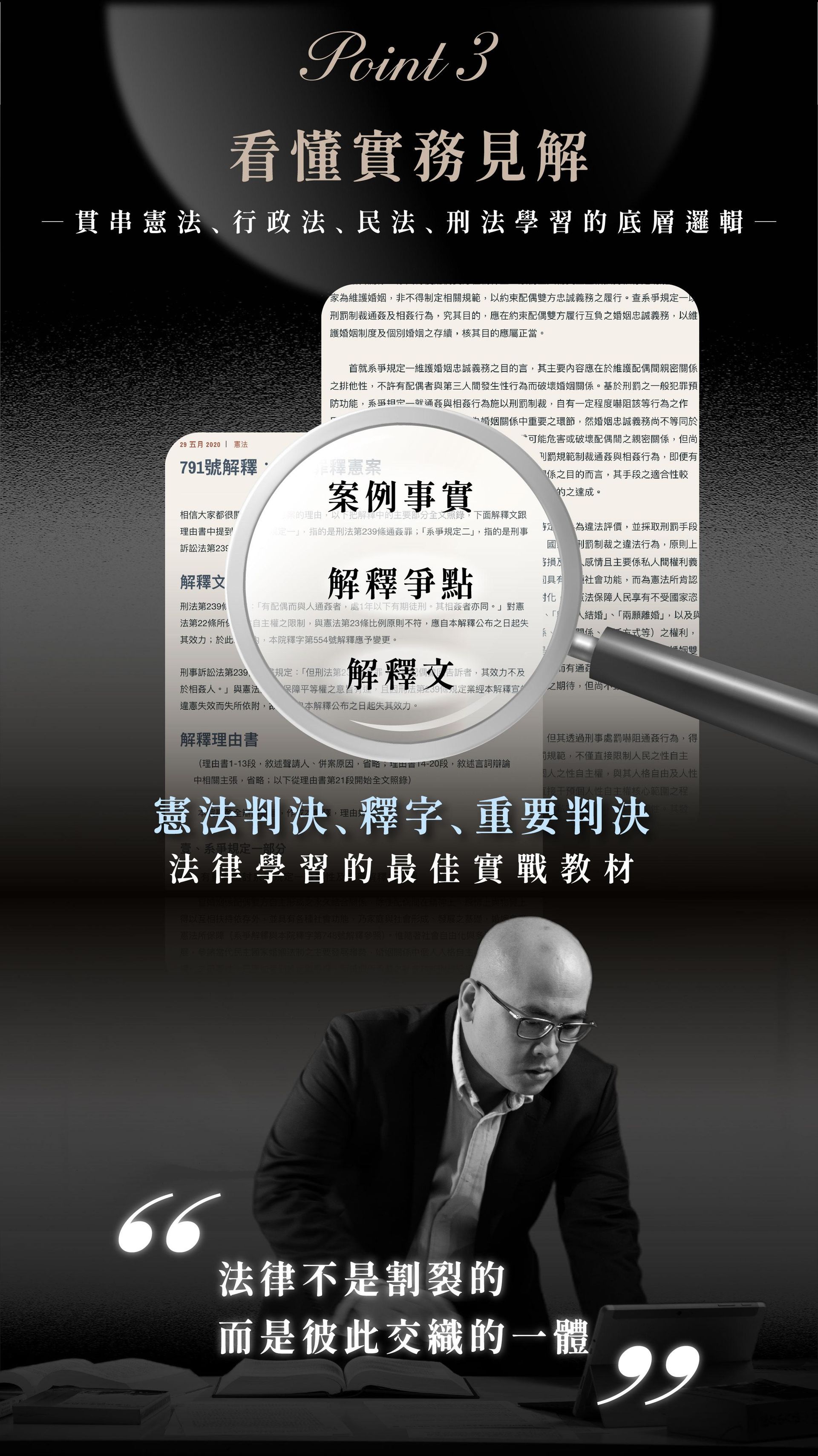 用憲法法庭、大法官釋字、重要判決,貫串法律學習的核心,構建系統性的知識