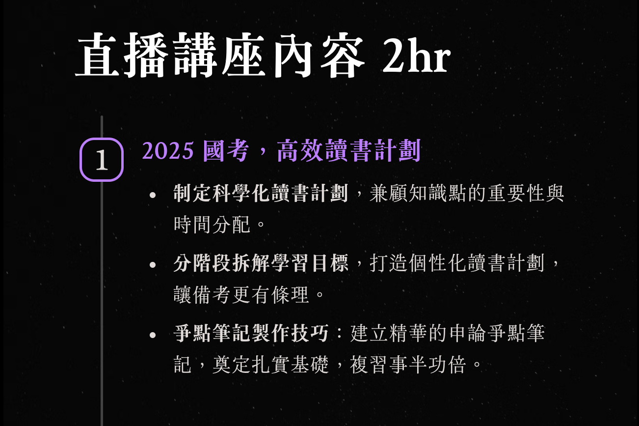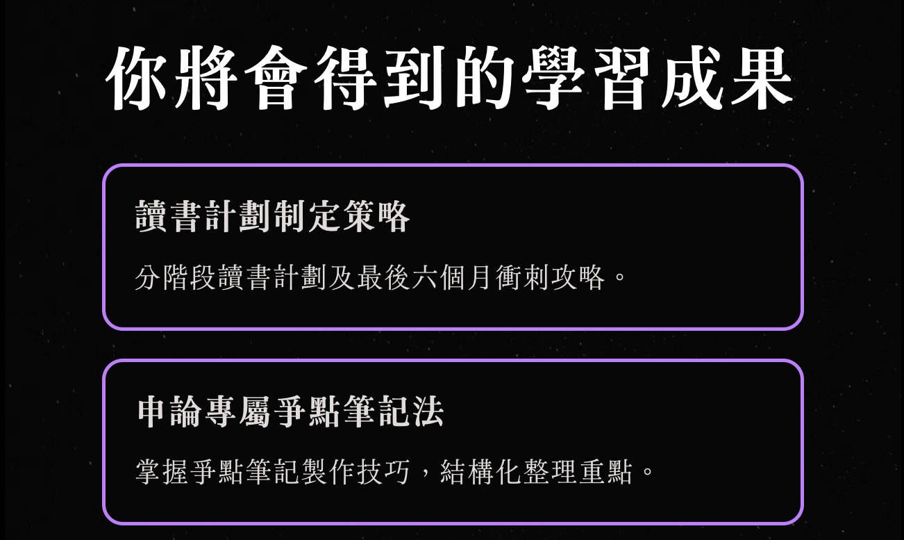 從科學化讀書計畫、目標拆解、爭點筆記製作到申論答題技巧,王昱忻律師將分享她應屆上榜的成功經驗為考生指點迷津。無論是臨時決定參加考試,還是已準備一段時間的同學,都能在過程中調整自己的備考狀態與節奏,逐步建立穩固的知識背景與答題策略。