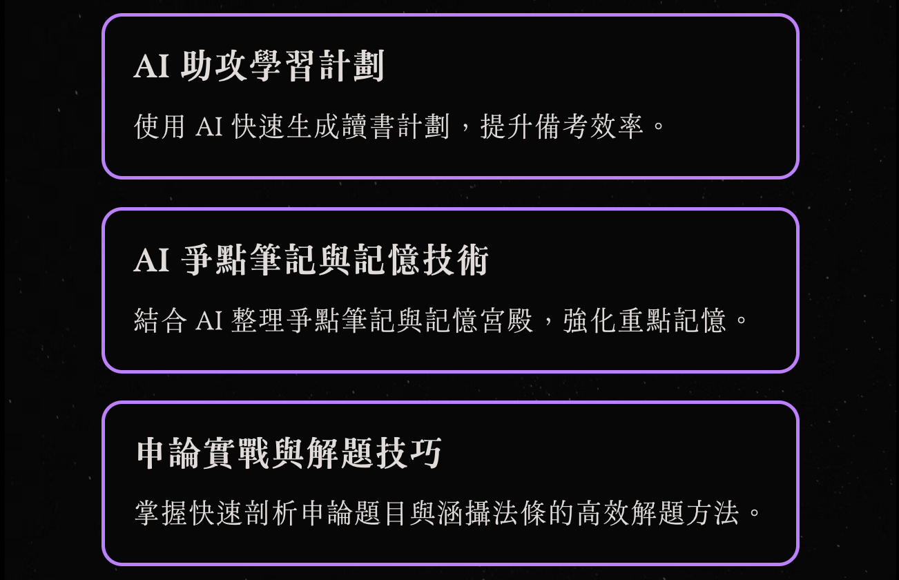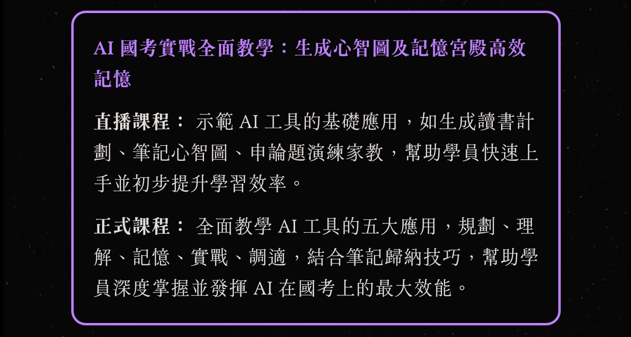 在精彩的對談環節中,兩位講師也將以實際案例,展示如何將讀書方法與 AI 工具極致結合,並帶領學員逐步調整 Prompt 與提問方向。除此之外,他們也將分享珍貴的備考減壓策略,教你如何保持專注、調適壓力、有效放鬆,並維持學習的動力與衝勁!